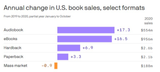 The pandemic has helped to revive the digital book industry. Data from The Association of American Publishers show that eBooks had been declining since 2014. But for the initial ten months of 2020, eBooks were up 16.5% contrasted with the 10 months of the earlier year, getting almost $1 billion.